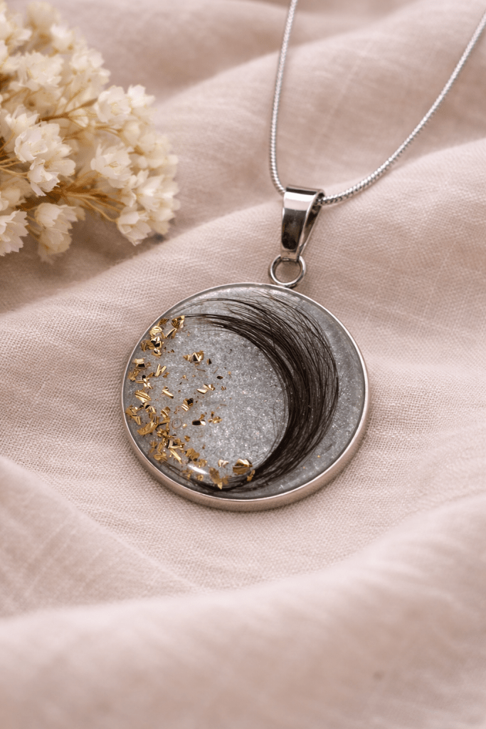 El cabello se integra cuidadosamente en la resina de la pieza, creando un diseño delicado que permite conservar ese recuerdo de forma segura y duradera.